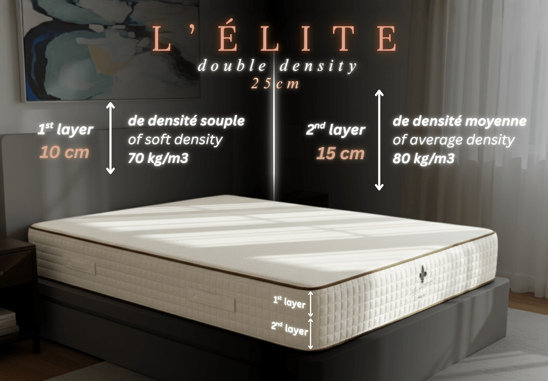 “L’Élite” Single size 90 X 200 X 25 cm = Double density 15 cm of average density 80 kg/m3 and sleeping face 10 cm of soft density 70 kg/m3