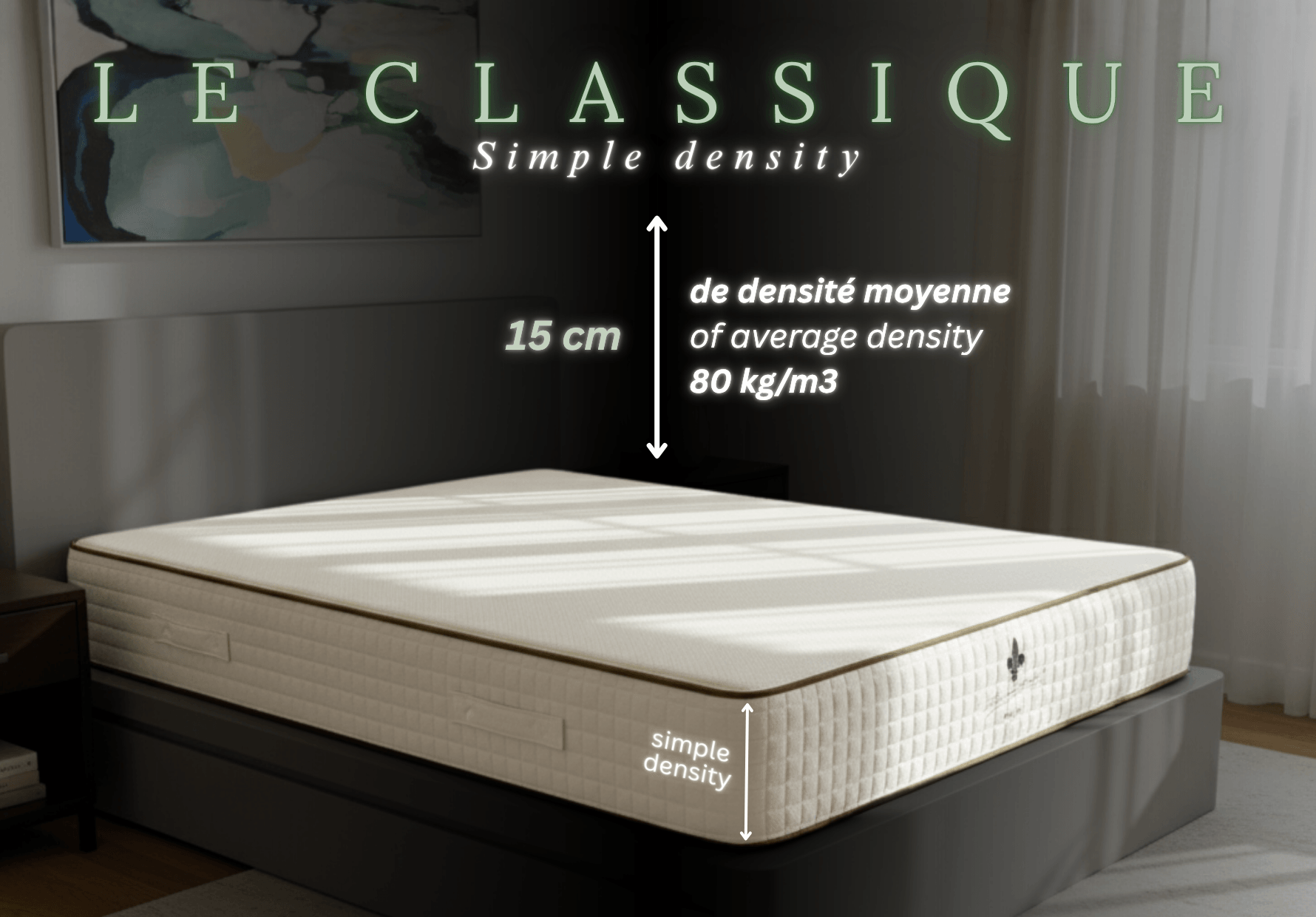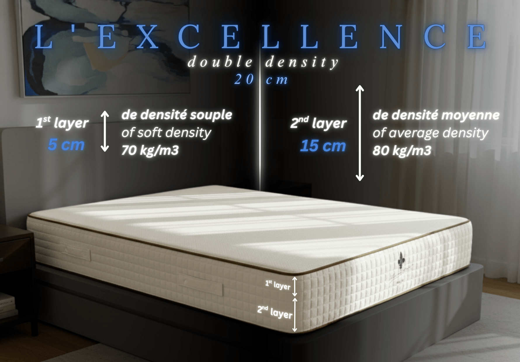 “L’Excellence” Single size 90 X 200 X 20 cm = Double density 15 cm of average density 80 kg/m3 and sleeping face 5 cm of soft density 70 kg/m3
