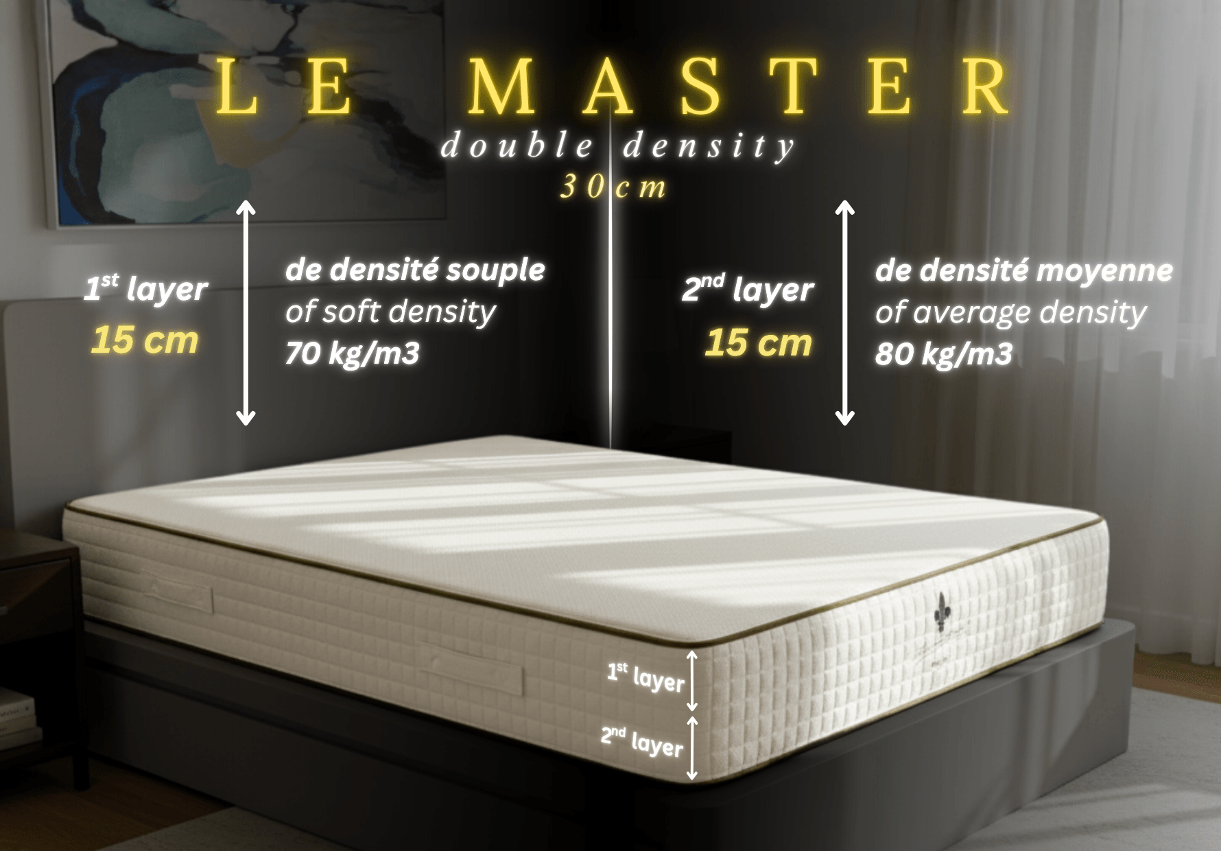 “Le Master Luxe” Single size 90 X 200 X 30 cm = Triple density 15 cm of average density 80 kg/m3, 10 cm of soft density 70 kg/m3 and sleeping face 5 cm of super soft density 60 kg/m3